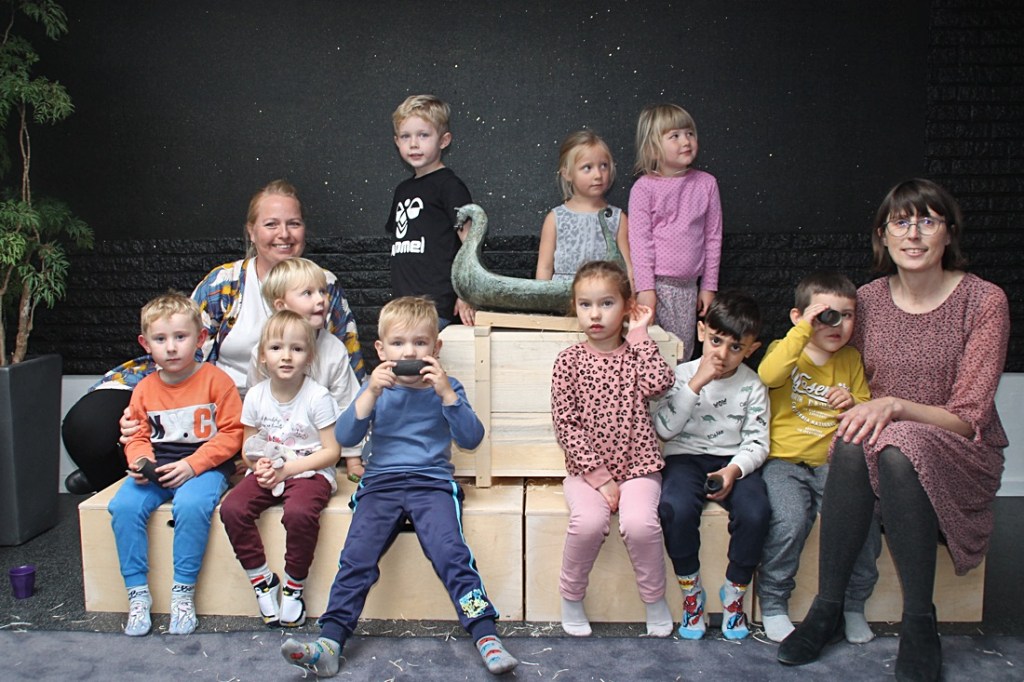 I Ølsted Børnehus. Børnene sidder på de kasser, som de største af Misja Rasmussens bronzeskibe,
